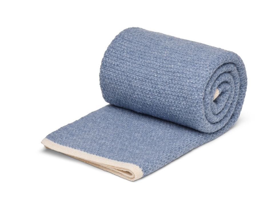 Undeniably soft and deeply comforting, this super soft chunky blanket is the kind of knit you’ll reach for every single day. Its gently heathered blue base and creamy border give it a calm, cocooning look, while the plush, weighty texture adds warmth without heaviness. Whether draped over your sofa, laid across a bed, or wrapped tightly around your shoulders — this is a blanket made to be felt. Chunky knitted structure with a luxuriously soft touch Soft blue mixed yarn body framed by a clean cream edge Ideal for lounging, reading, or gifting to someone you really like Wool blend provides natural warmth with a gentle, modern handfeel Crafted using surplus yarns to reduce waste and maximise beauty Your new favourite comfort piece — soft, soulful, and made to last.