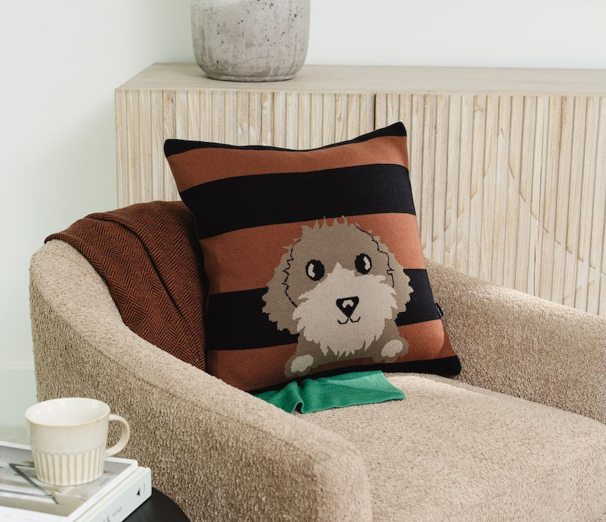 Soft, sweet, and totally irresistible — the Fluff & Paws Cushion Cover features a wide-eyed pup nestled against bold cocoa and black stripes. Whether you’re a dog person or just love a bit of personality in your décor, this cushion brings warmth and playfulness to any space. Fully knitted graphic design made with leftover yarns Soft-touch cotton blend with subtle texture 45x45cm square – perfect for sofa layering or kids’ rooms Clean back opening for easy insert/removal (inner not included) Designed with love and sustainably crafted A cosy companion for your home — cuddle up with Fluff & Paws. ** Cushion pad not included.