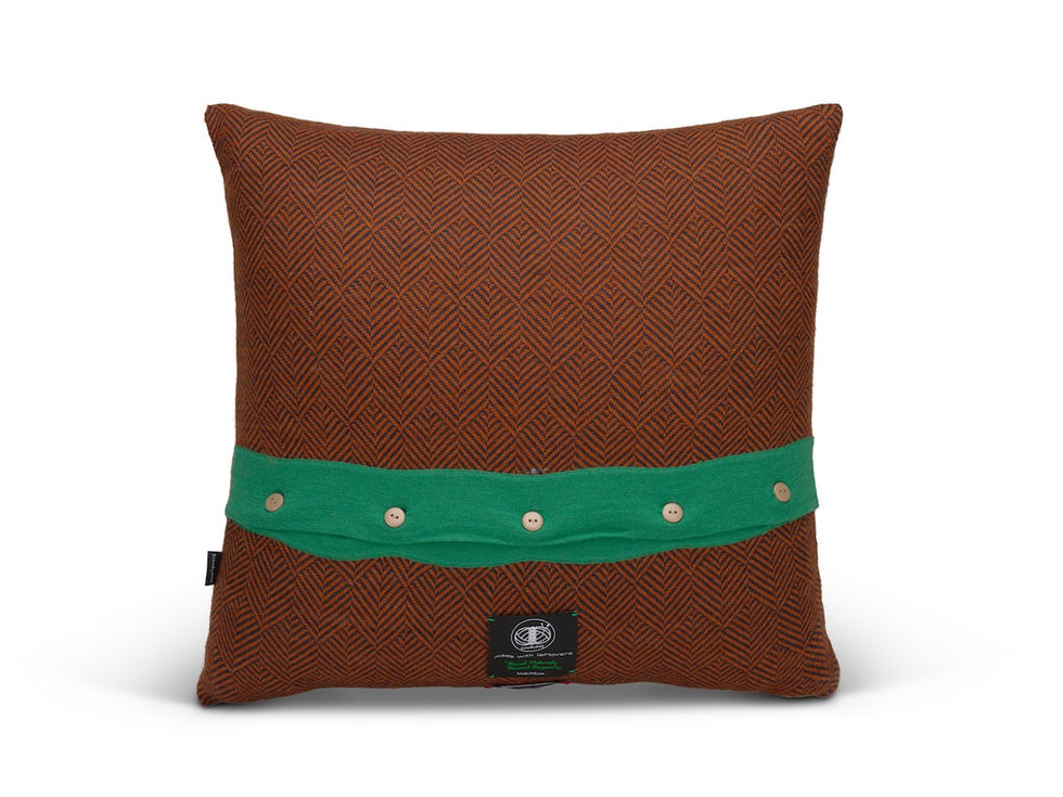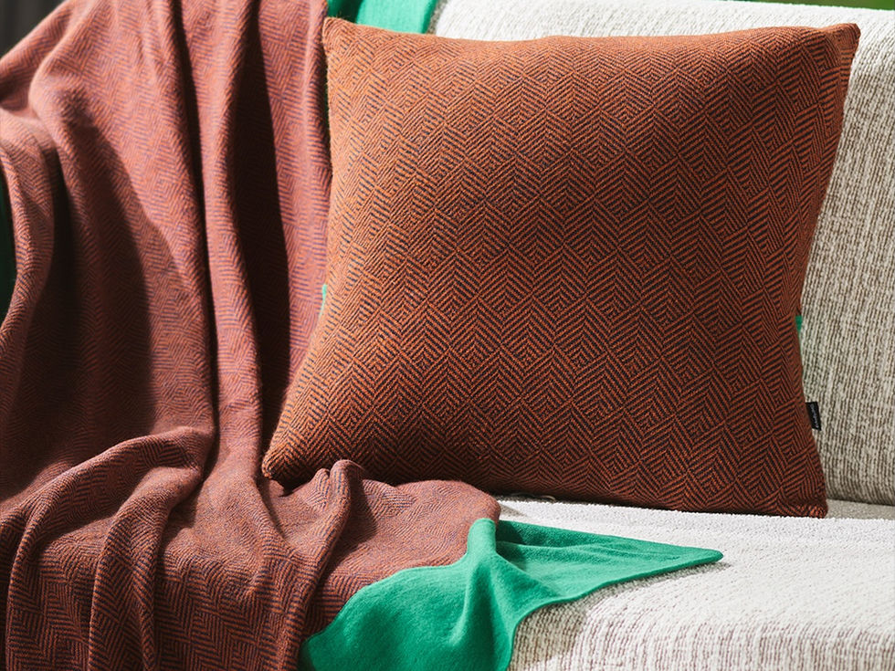 Our Lucky Arrow Cover blends warmth, texture, and timeless design. Knitted in 100% wool, the intricate arrow-like pattern in deep copper and navy brings a sense of movement and quiet sophistication, while the sage green border adds a gentle pop of contrast. Crafted from carefully selected leftover yarns in our factory, it’s a sustainable expression of refined comfort — perfect with the matching Lucky Arrow Blanket.