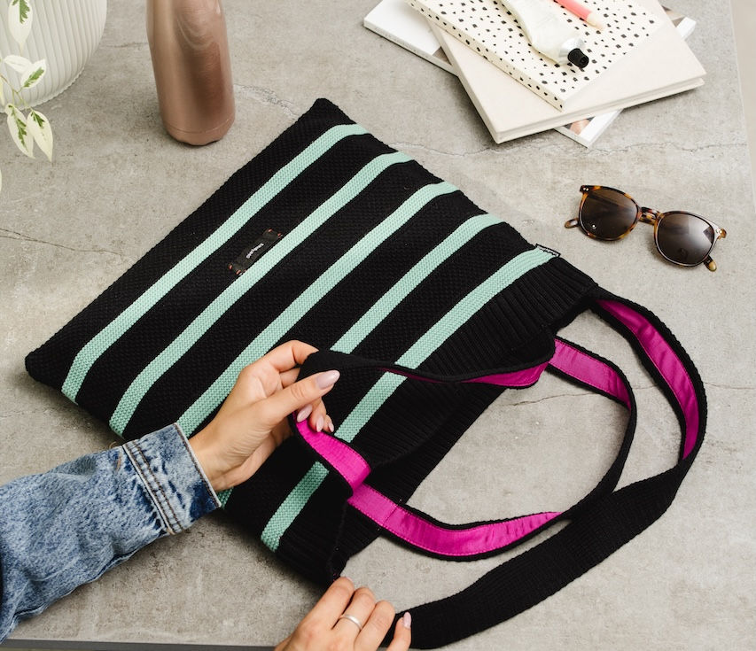 A minimal yet distinctive carryall crafted entirely from surplus yarns, this tote brings sustainable fashion into your everyday life. The structured horizontal stripe design adds subtle texture and rhythm, while the neutral colour palette in Doe or Black makes it a versatile styling piece. Double strap design: one short handle and one shoulder-length strap for flexible wear Fully knitted using upcycled yarns – no two are exactly alike Soft yet durable construction suitable for daily use Fits your essentials, from notebooks to a water bottle, with ease Size: 40cm x 30cm Eco-luxe with a purpose – crafted to be carried, loved, and re-used.