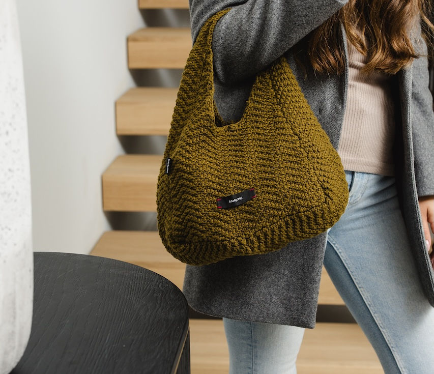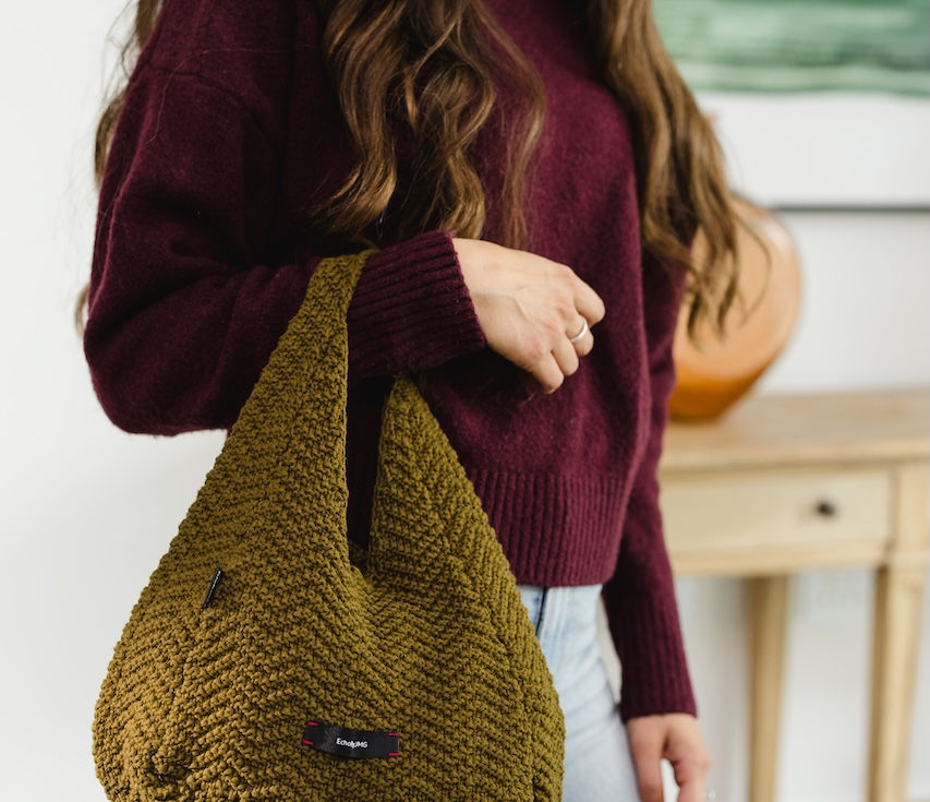 A modern classic with a tactile twist. This version of our signature Dumpling Bag features a richly textured knit that brings depth and dimension to its sculptural form. Crafted from a sustainable blend of 50% organic cotton and 50% recycled cotton, it's soft yet structured — ideal for everyday wear. Designed with a triangular opening, it’s available in Violet Blue and Olive Green to suit your bold or earthy moods.